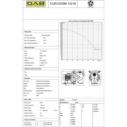 EUROSWIM 150 – Swimming Pool Pump – 1.5 HP – 230V- 6840 GPH